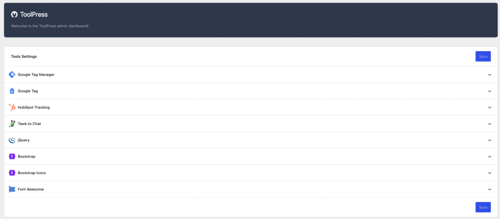 ToolPress supports Google Tag Manager, HubSpot, jQuery, Bootstrap, Font Awesome, Tawk.to chat, and more.